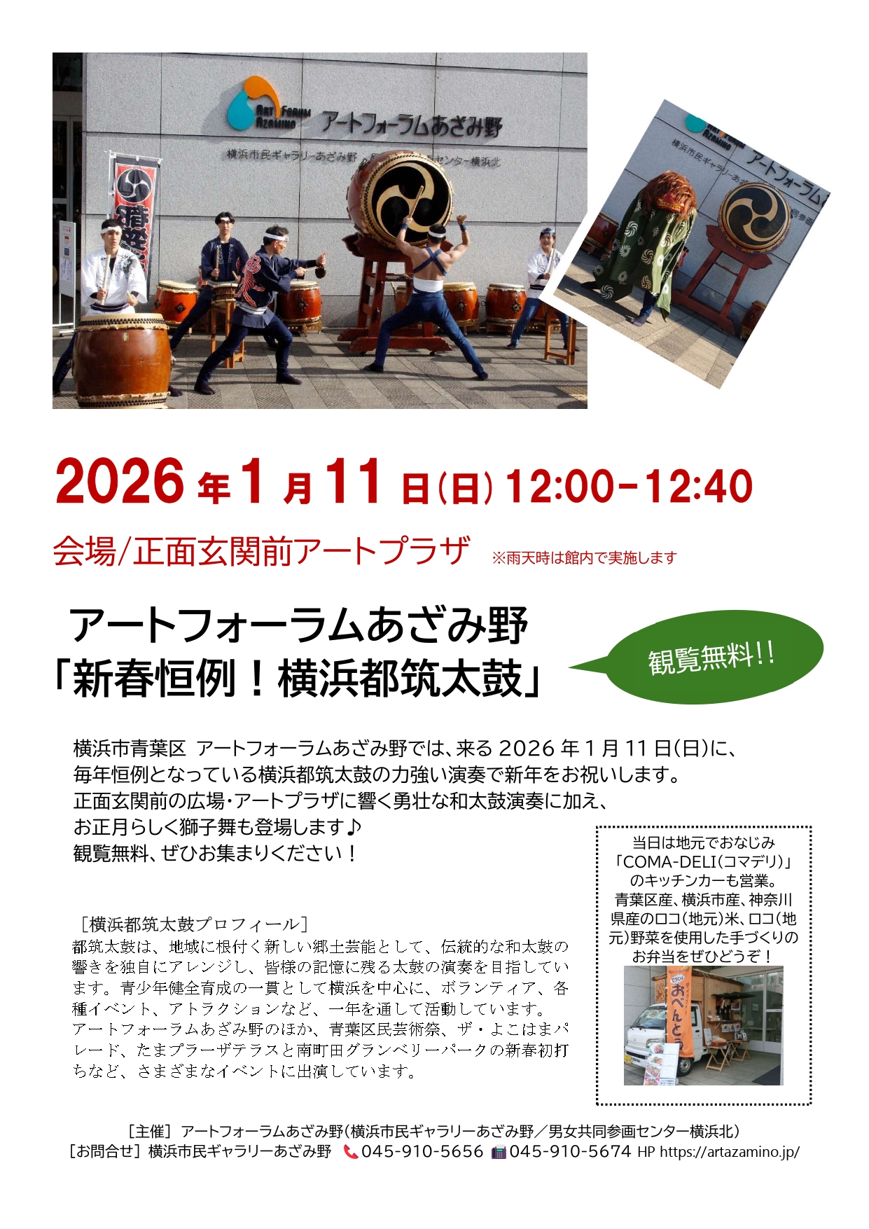 来る令和8(2026)年1月11日(日)に、毎年恒例となっている横浜都筑太鼓の力強い演奏で新年をお祝いします。